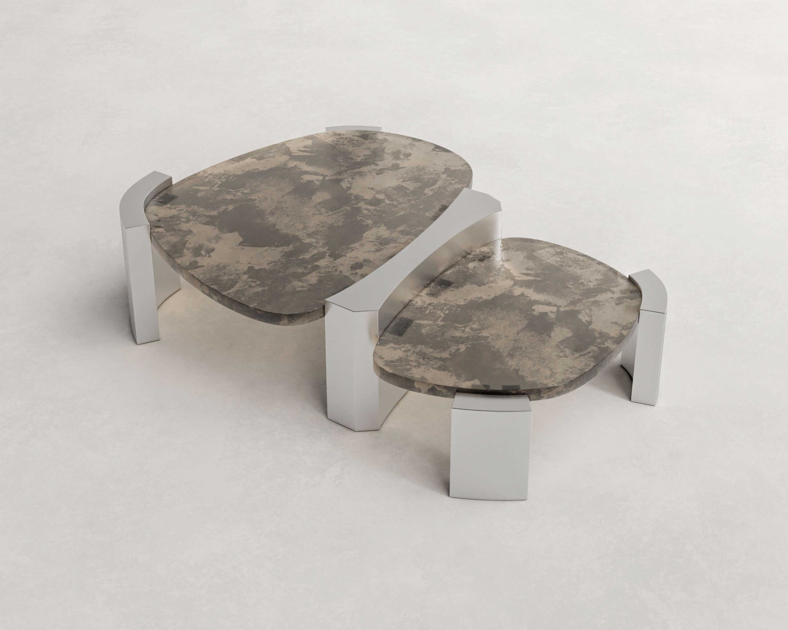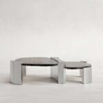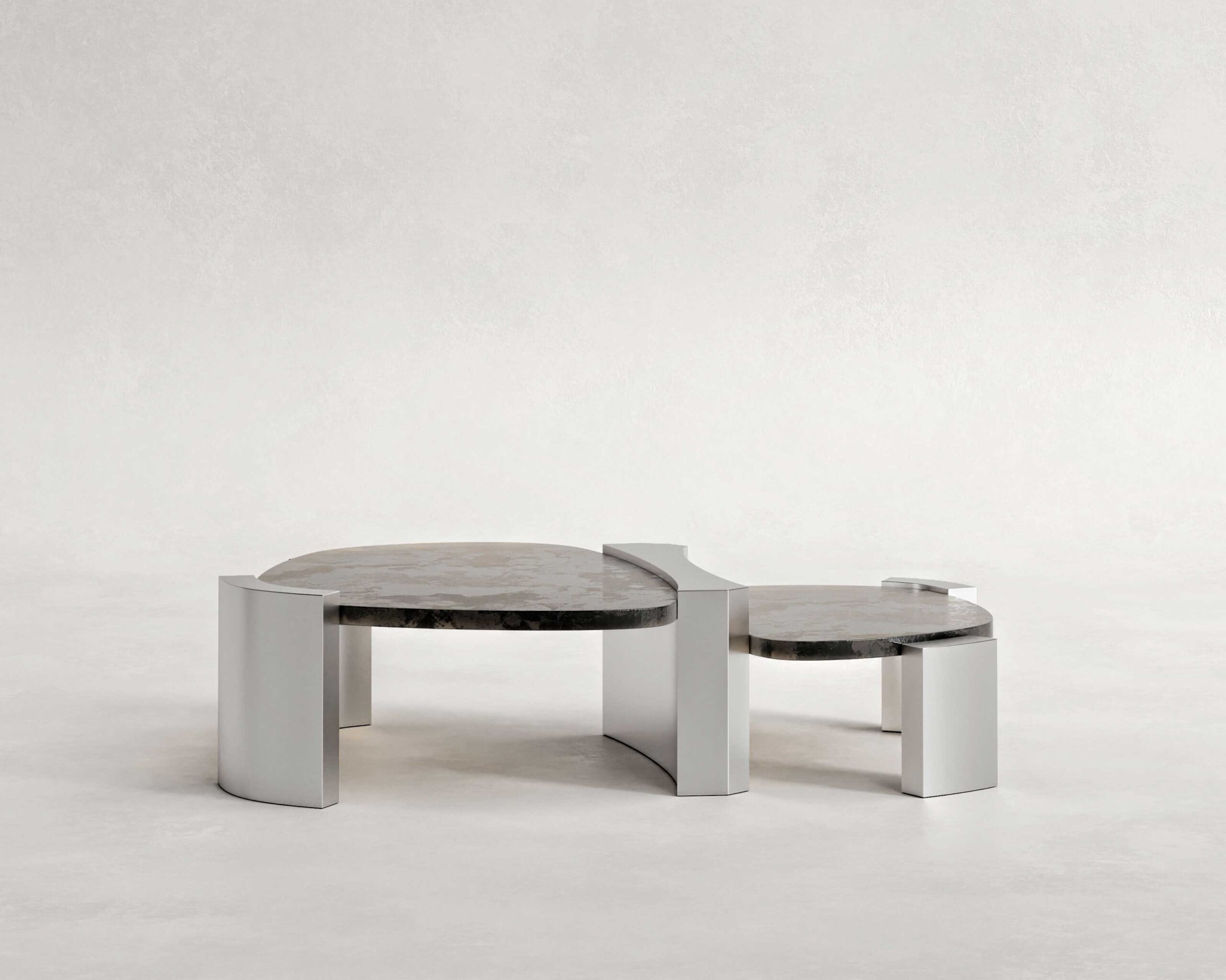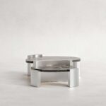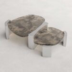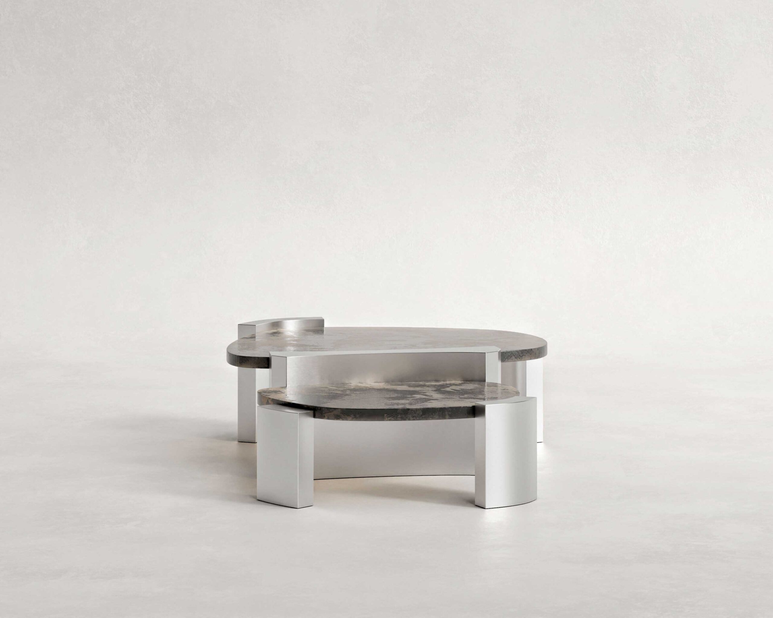 Doppia Coffee Table is a study in stratification and balance. Composed of two intersecting planes, the piece creates a kinetic dialogue between levels, suggesting movement even in stillness. The architectural framework is defined by faceted pylons of brushed stainless steel, which clasp the surfaces with industrial precision.