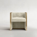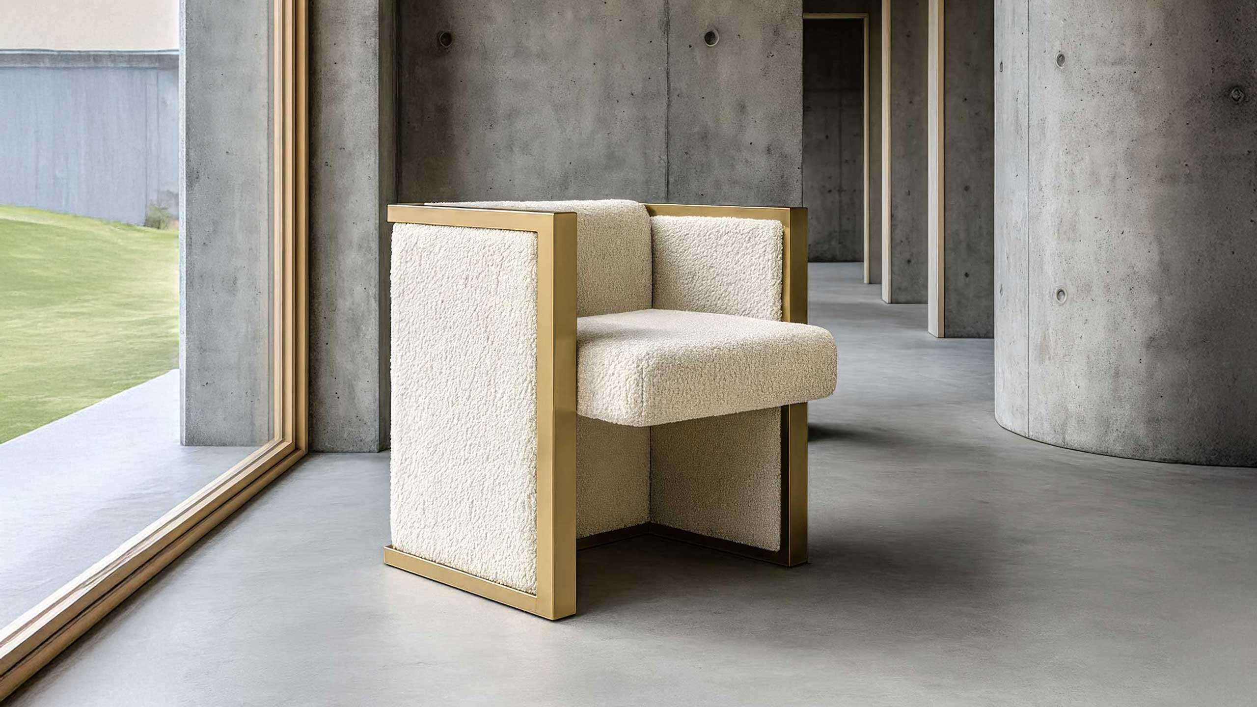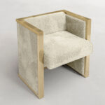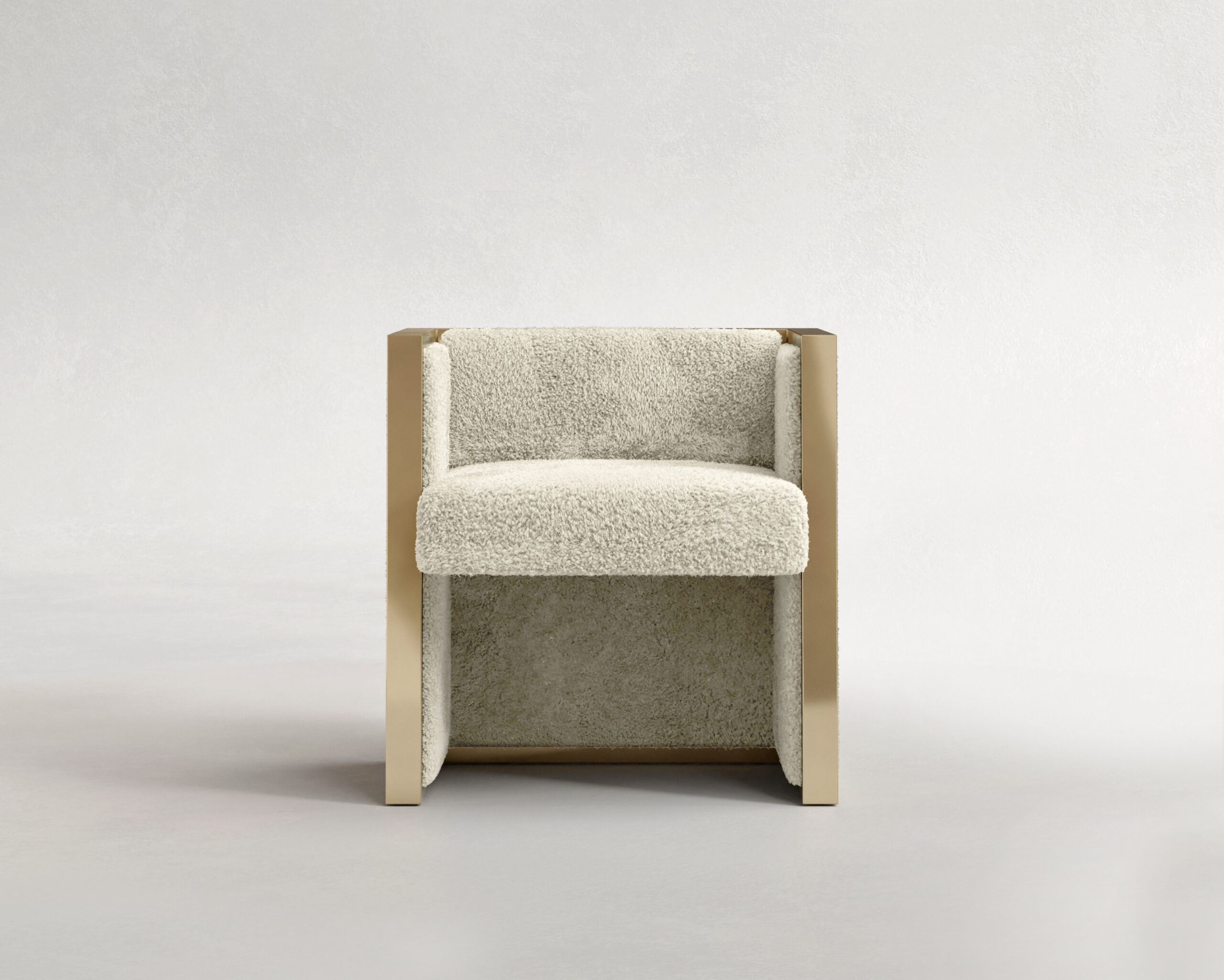 Frame Dining Chair operates as an exercise in architectural containment. Its defining feature is a continuous, polished metallic exoskeleton that outlines a rigorous cubic geometry, effectively framing the negative space around it. Within this disciplined framework resides a contrasting volume of tactile shearling, offering a softness that defies the rigidity of the structure.